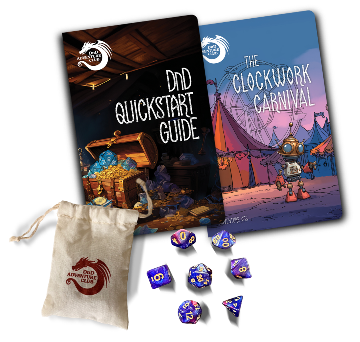 Your first delivery includes everything needed to start playing immediately: our streamlined DnD Quickstart Guide, a complete adventure book, and a full set of polyhedral dice—bundled for $29.99.